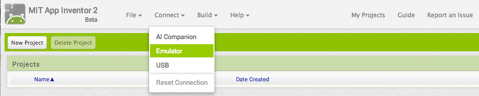 From App Inventor’s menu (on the App Inventor cloud-based software at ai2.appinventor.mit.edu), go to the Connect Menu and click the Emulator option.
