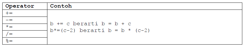 Assignment operator ( = ) digunakan untuk melakukan penugasan sebuah nilai pada sebuah identifier .
